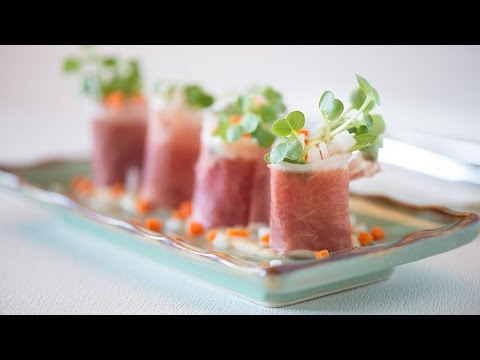 Prosciutto di Parma Rolls with Asian Pear, Daikon Sprouts and Wasabi Aioli - Prosciutto Ham Appetizers - Recipe at: http://ciaprochef.com/legends-from-europe/recipe1/ Chef Bill Briwa from The Culinary Institute of America shows us how to make a tasty and elegant ...
